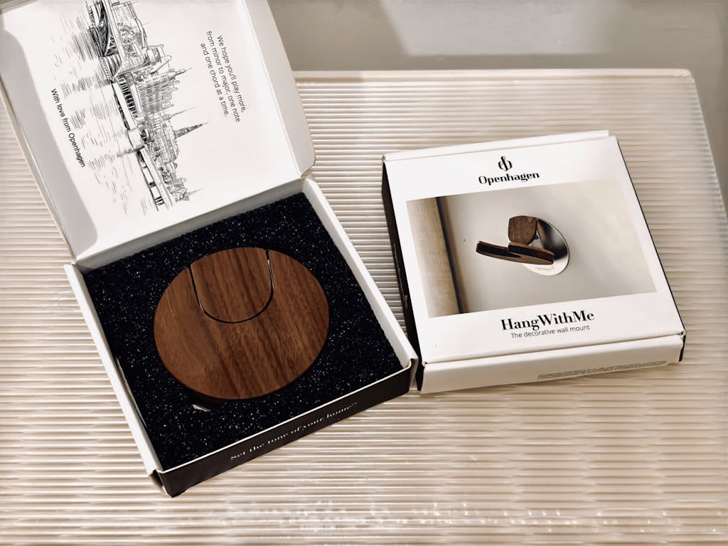 Es handelt sich um die weltweit einzige zusammenklappbare Wandhalterung für Ukulelen, Banjos und Mandolinen, die ein patentiertes dänisches Design des preisgekrönten Duos Harrit-Sorensen vereint.