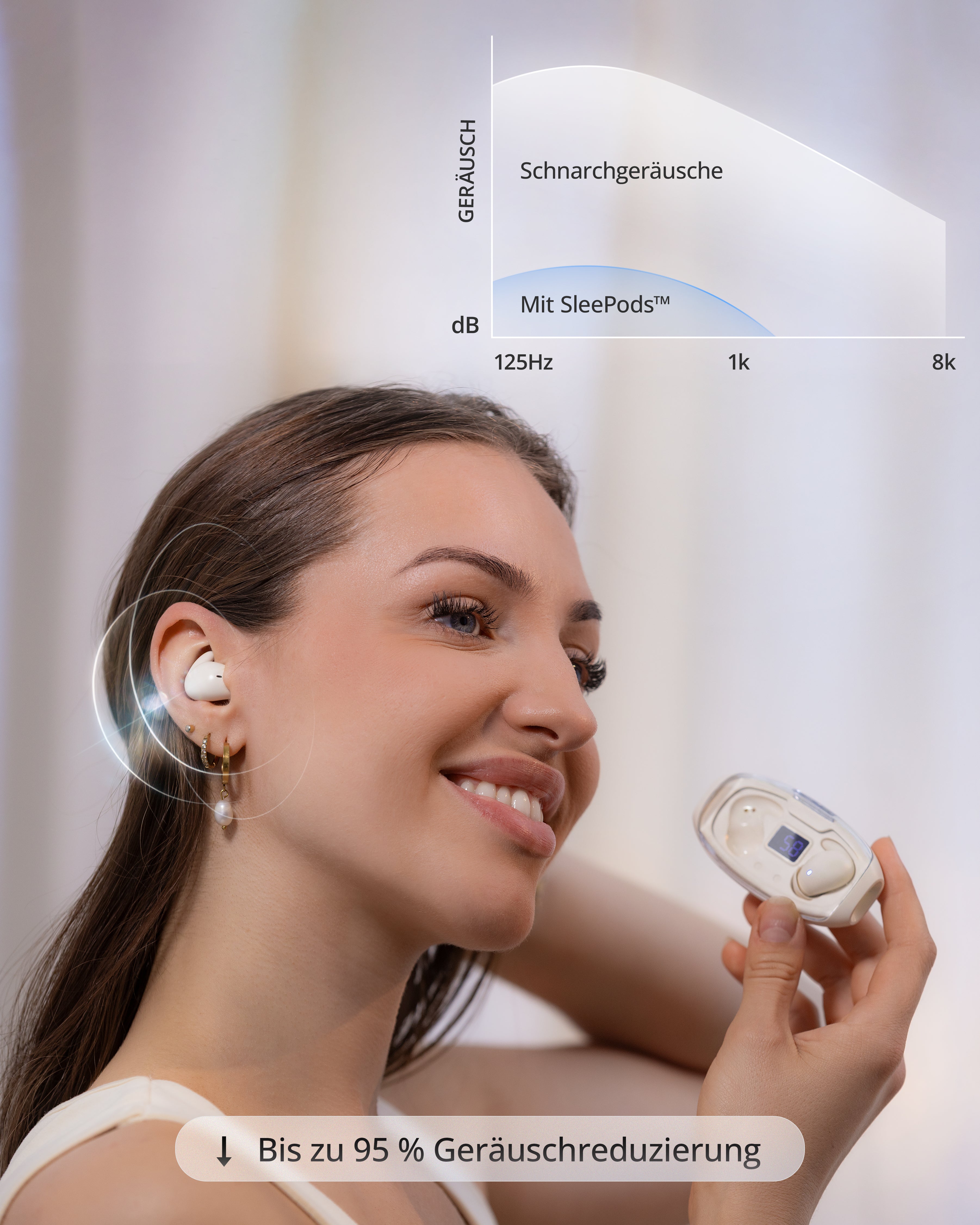 SleePods™ wurden speziell für echten Schlaf entwickelt. Im Gegensatz zu AirPods oder Ozlo verfügen sie über ein zum Patent angemeldetes Design für Seitenschläfer, eine aktive Geräuschunterdrückung (ANC) gegen Schnarchen und eine ultradünne, druckfreie Form – und das alles ohne App-Abhängigkeit oder Einschränkungen, die ausschließlich auf den Schlafbereich beschränkt sind.